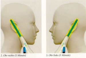2.+3.) Ohr rechts + Ohr links - jeweils für 2 Minuten. Wenn noch nie befeldet wurde: beide Ohren für 5-10 Minuten. Wenn sich die befeldete Stelle stark erwärmt, ist es empfehlenswert, die Handsonde auf dem Ohr wandern zu lassen.